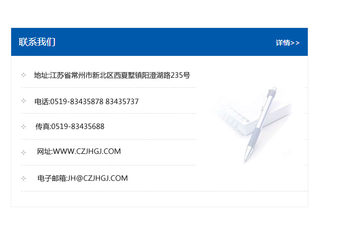 地址:常州市新北區友邦商務大廈1幢16、17層  電話:0519-85101652  傳真:0519-85112595  郵編:213022  網址:www.cz-jiayue_cn.1000yang.com  郵箱:xiajifengaa@163.com